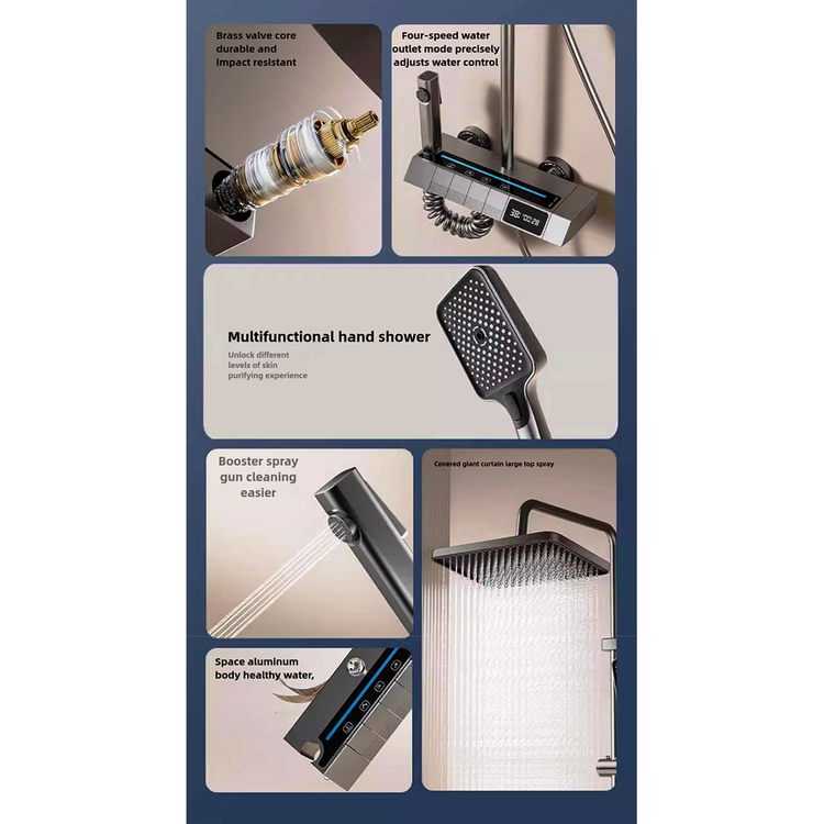 این دوش با طراحی پیانویی دیواری، امکان نصب سریع و شکیل را فراهم میکند. نمایشگر دیجیتال (برای دما / زمان / حالت آب) به شما کمک میکند کنترل کامل روی حمام داشته باشید؛ مثلاً بدانید آب گرم آماده است، زمان دوش را رصد کنید یا حالت خروجی آب را دقیق تنظیم نمایید.