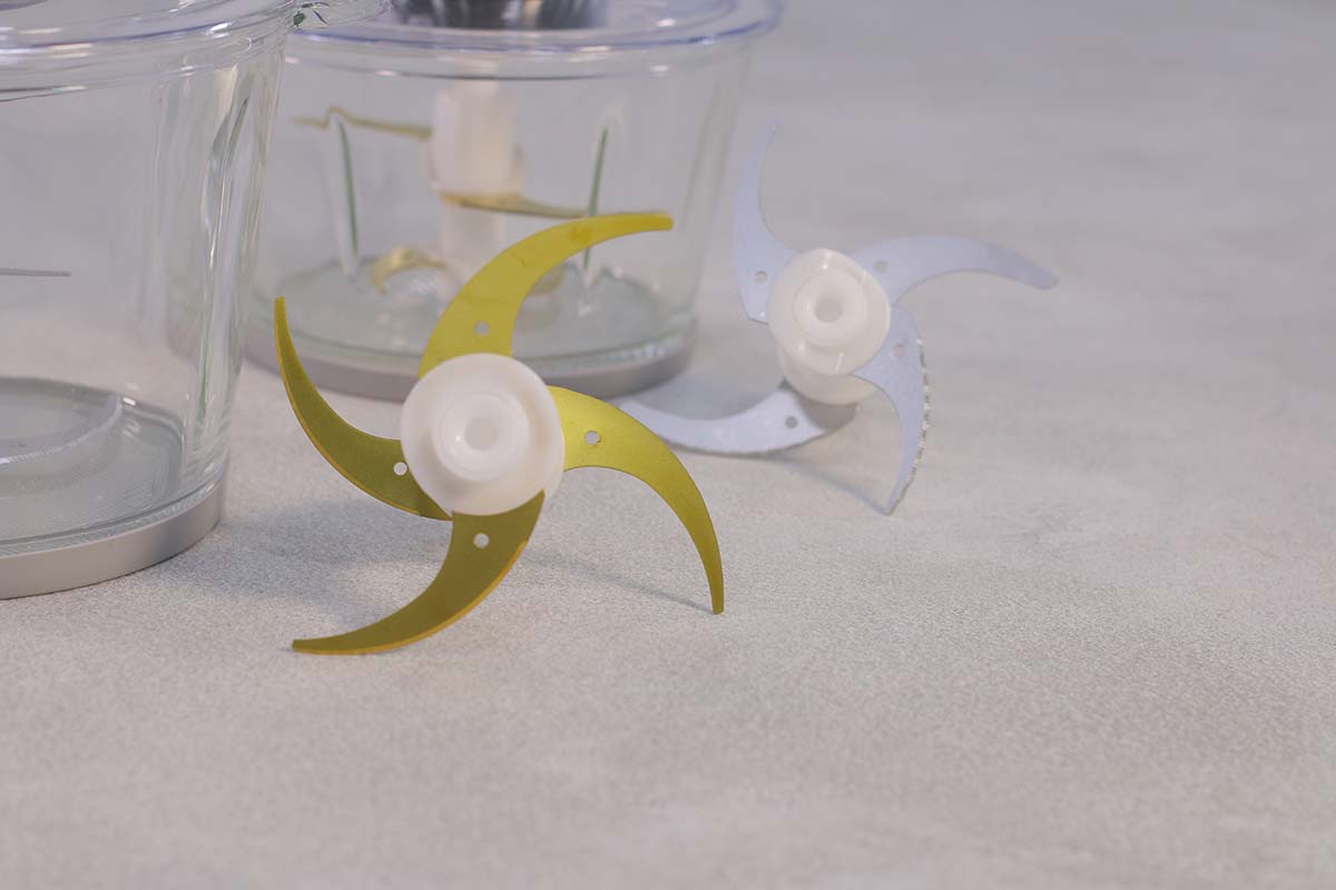 تیغه طلایی از جنس تیتانیوم است که مقاومت بسیار بیشتری در برابر کند شدن دارد و برای خرد کردن گوشت و آجیل مناسبتر است.